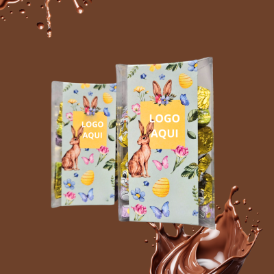 São 30 mini coelhinhos num delicioso chocolate de leite crocante, colocados numa bonita e transparente embalagem e seladas com uma sleeve personalizada para a sua empresa!